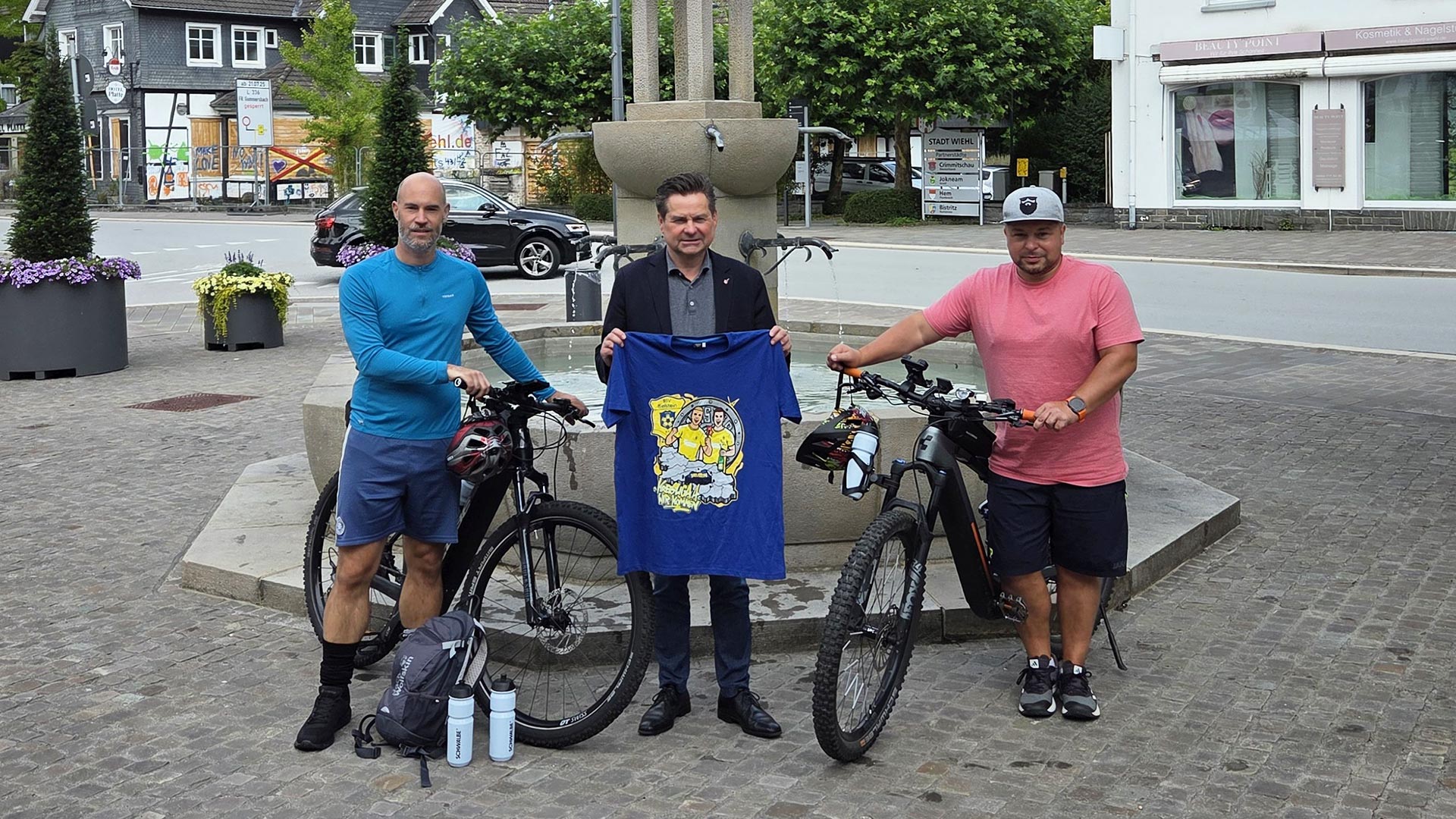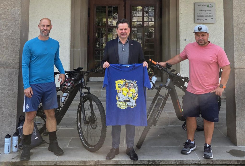 Verabschiedet wurden die beiden von Bürgermeister Ulrich Stücker vor dem Wiehler Rathaus. Im Gepäck: ein Trikot zur Erinnerung an den Aufstieg des BSV Bielstein in die Kreisliga A – bestimmt für Crimmitschaus Oberbürgermeister André Raphael, einen langjährigen Freund der Stadt Wiehl. Pethe ist nicht nur sportlich, sondern auch als Mitglied des Partnerschaftsvereins in der Verbindung zwischen beiden Kommunen engagiert.