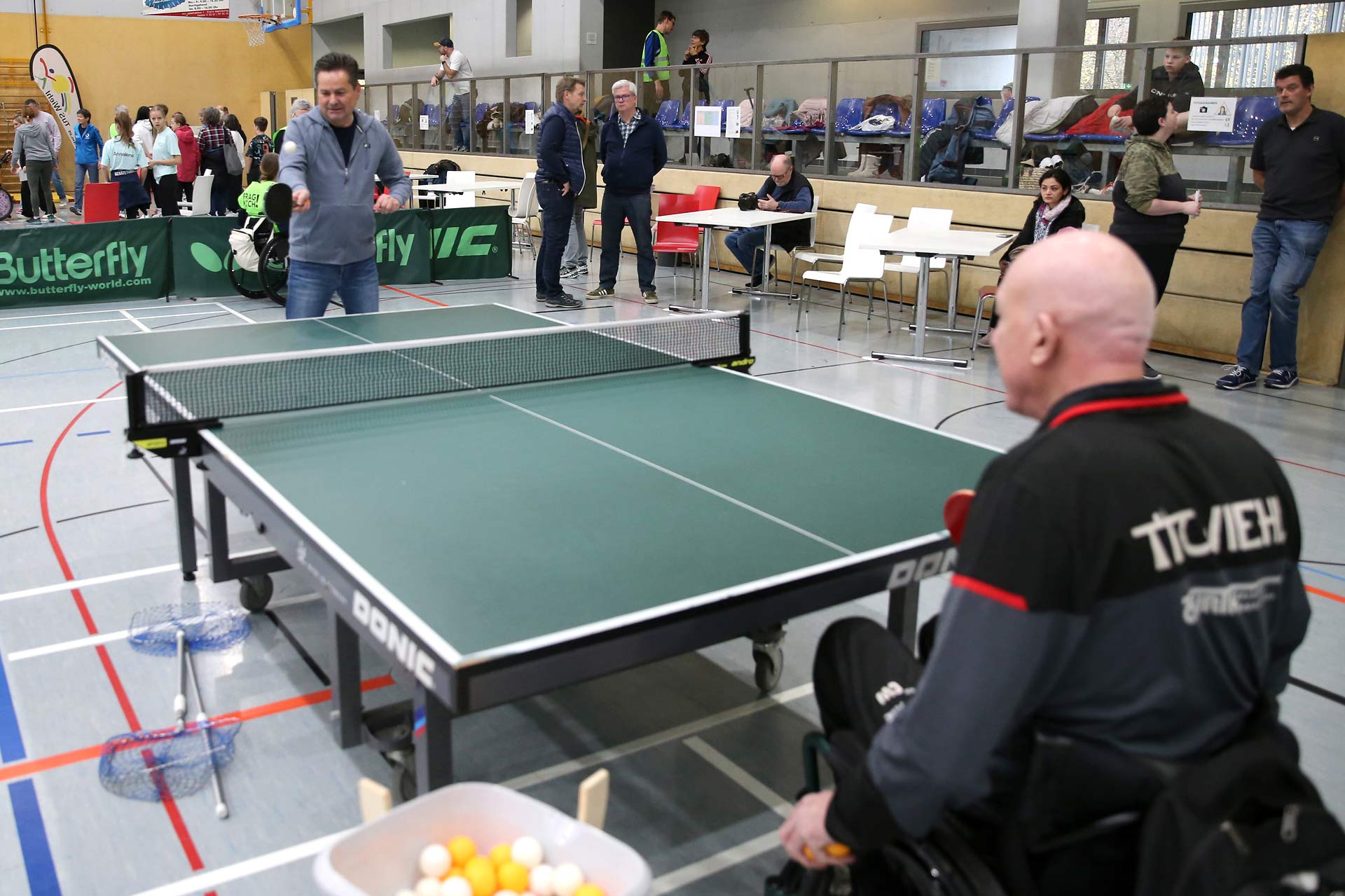 Zudem gab es einen Fitness-Parcour für alle und mit „Fit für 100“ Bewegungsangebote für jedes Alter. Einen umjubelten Auftritt hatten „Die Pompösen“, eine Cheerleader-Gruppe des HBW-Wohnheims für Menschen mit Beeinträchtigung. Beim Rollstuhltennis traute sich Bürgermeister Ulrich Stücker, gegen den früheren Paralympics-Gewinner Charly Weber anzutreten, der ihm attestierte: „Die Grundlagen sind da.“ Angesichts des Sportfestes betonte der Bürgermeister: „Inklusion ist auch eine Bereicherung für Menschen ohne Beeinträchtigung.“