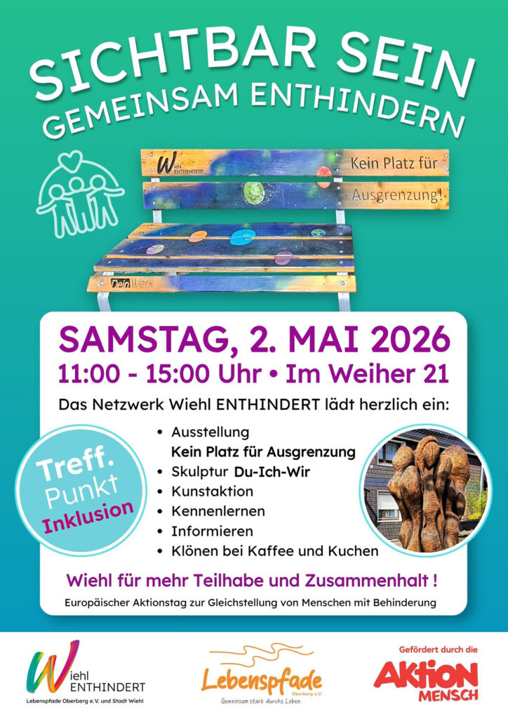 Anlässlich des Europäischen Protesttags zur Gleichstellung von Menschen mit Behinderung lädt das Projekt Wiehl enthindert von Lebenspfade Oberberg e.V. am 2. Mai von 11:00 bis 15:00 Uhr zu einer inklusiven Aktion in Wiehl ein. Veranstaltungsort ist der Treffpunkt Inklusion, Im Weiher 21 (bei schlechtem Wetter im Rathaus).