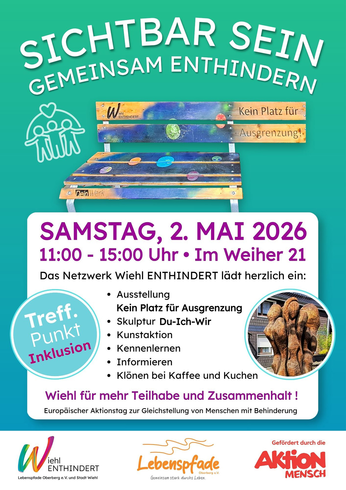 - Bildhauer Roland Glatz–Wieczorek präsentiert seine Skulptur „Du-Ich-Wir“, die seit dem 27. März vor dem Treffpunkt Inklusion steht, und lädt in einer begleitenden Kunstaktion zum Mitmachen ein. So wird Kunst erlebbar und lädt zum Mitgestalten ein.