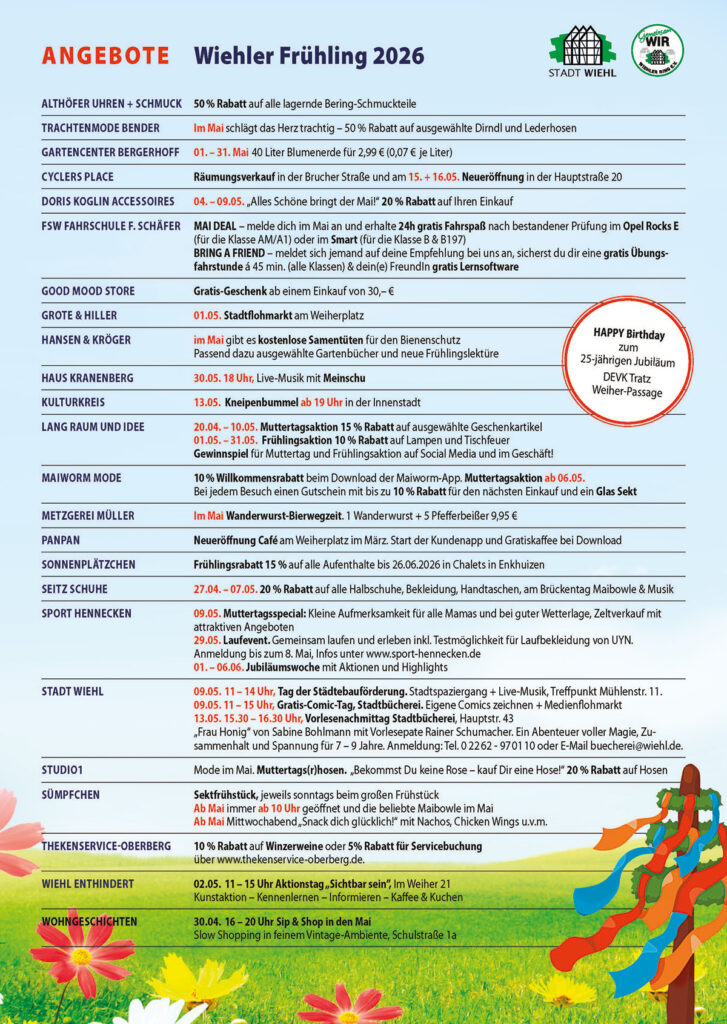 Bereits am Tag darauf findet auf dem Weiherplatz der beliebte Stadtflohmarkt von Grote & Hiller statt. Die Akteure des Einzelhandels und der Gastronomie haben sich für den gesamten Mai Aktionen überlegt: In den verschiedenen Geschäften gibt es Rabatte und Geschenke. Darüber hinaus veranstalten Stadt Wiehl und Wiehler Ring ein Gewinnspiel, passend zur Frühlingsdekoration im Zentrum. Denn die Innenstadt schmücken im Wonnemonat jede Menge Maibäume. Wer richtig rät, wie viele es sind, kann eine Reise, Geld oder Gutscheine der Wiehler Geschäfte gewinnen. Der Teilnahmezeitraum reicht vom 1. bis zum 19. Mai.