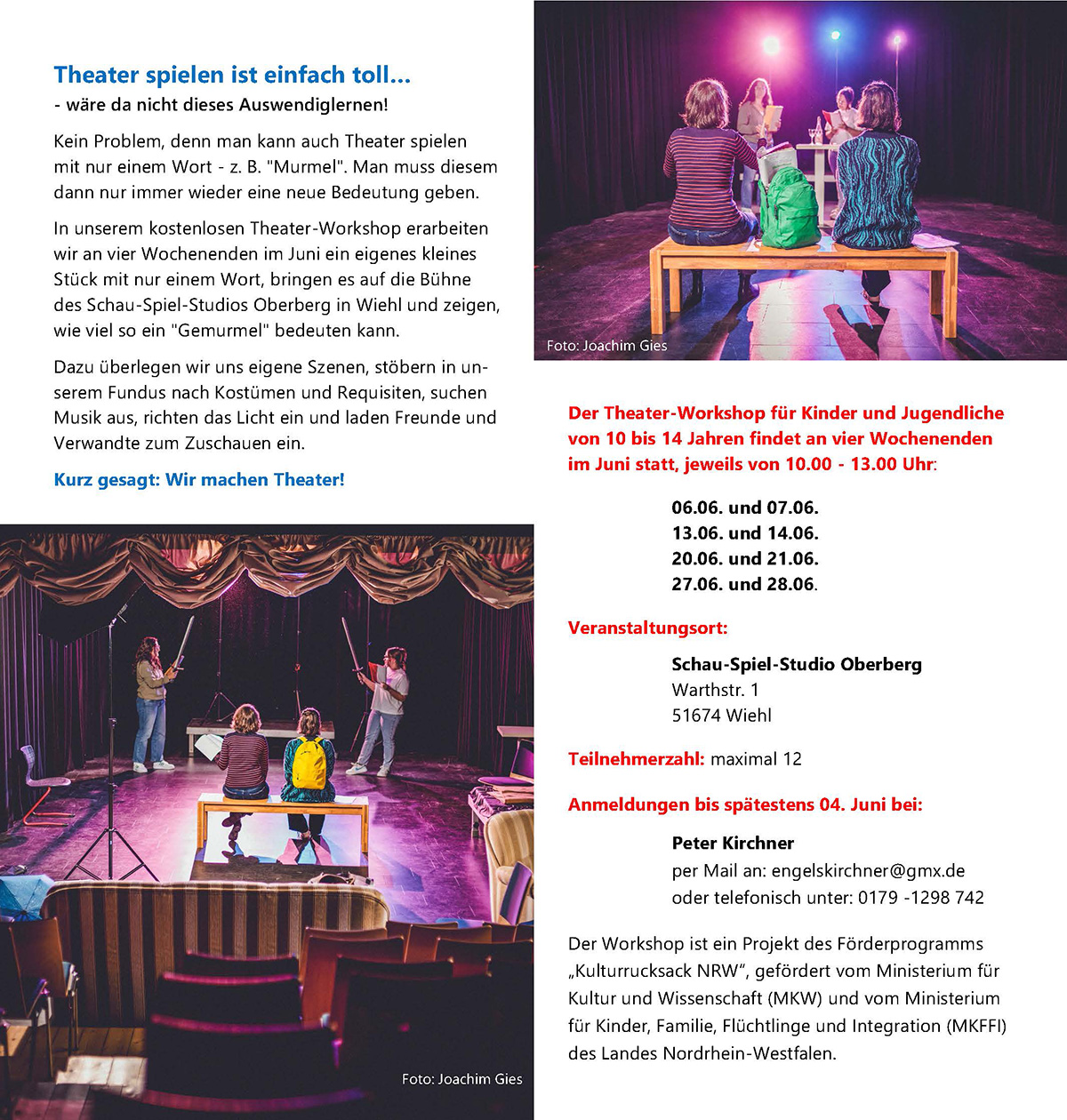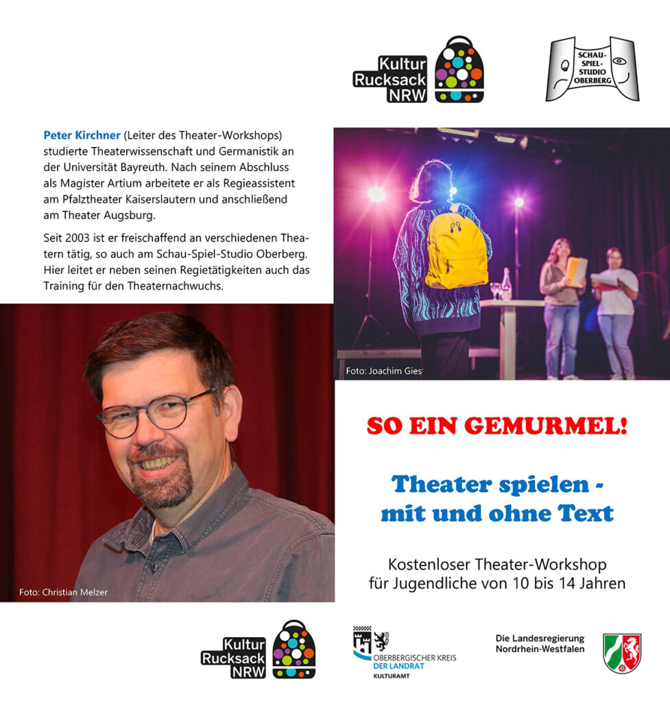 Geleitet wird der Workshop von Peter Kirchner, langjähriger Regisseur am SchauSpielStudio Oberberg. Er bringt seine umfangreiche Erfahrung von verschiedenen deutschen Bühnen ein und begleitet den Nachwuchs mit professionellem Blick und viel Spielfreude.